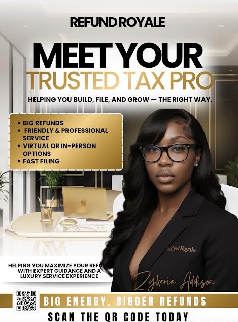 Zykeria Addison is a trusted Team Lead with Refund Royale, known for her professionalism, accuracy, and dedication to maximizing every client’s refund. She specializes in identifying all major credits including CTC, EITC, HOH, AOTC, and more — ensuring her clients never leave money on the table.